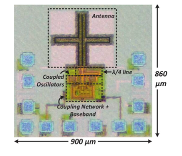 Professor Aydin Babakhani’s group published a novel complementary self-injection-locked (CSIL) radar architecture for low-power, high-accuracy THz phase sensing in IEEE Transactions on Microwave Theory and Techniques. Unlike conventional phase-sensing radars, the CSIL technique does not require frequency synthesis, enabling a compact architecture with low power consumption. It consists of a coupled oscillator pair with envelope detectors that sense oscillation amplitude. The oscillator is connected to a novel on-chip hybrid-mode dual-polarized slot antenna for radiation. The CSIL radar employs the self-injection locking (SIL) technique, where a portion of the transmitted signal reflects off the target and is reinjected into the radar. Due to the coupled nature of the system, this self-injection process induces an amplitude imbalance between the oscillators as a function of target distance. By measuring this amplitude imbalance with the envelope detectors, the system can estimate relative displacements within an unambiguous range of λ/4. The CSIL architecture is inherently immune to self-interference. It also features an autodyne design with a single-phase center, allowing easy integration with external optics such as lenses or mirrors. The radar is fabricated using the TSMC 65-nm process. Operating at 232GHz, it achieves a static range accuracy of 20μm while consuming only 4.6mW of dc power. The architecture also supports 3-D imaging, demonstrated through preliminary imaging experiments. These results establish CSIL as a promising solution for compact, energy-efficient mm-wave and THz sensors for precision sensing and imaging applications.