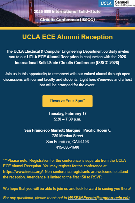 UCLA’s ECE department will be hosting an Alumni Reception at the ISSCC Conference in San Francisco on Feb 17 from 5:30-7:30pm. Join us for this opportunity to reconnect with our valued alumni through open discussions with current faculty and students.
