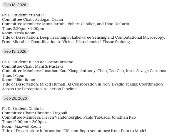 To be included in future newsletters, please send the latest news, awards, publications and any upcoming PhD oral defenses to the Chair’s assistant, Winda Mak, at wmak@seas.ucla.edu. Please include “newsletter submission” in the subject line. The ECE newsletters will be sent bimonthly on the first and third Mondays of the month. Please ensure all submissions are received by the Wednesday before distribution to be included in the newsletter.