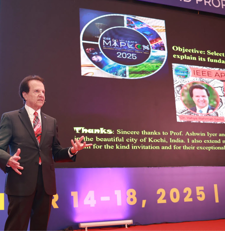 Distinguished Professor Yahya Rahmat-Samii delivered an hour-long Master Talk entitled “From Darwin to Swarms to Brainstorms: Evolutionary Optimization for Modern Electromagnetic Engineering Design” at the 2025 IEEE Microwave Antennas and Propagation Conference (MAPCON). The conference was held in Kochi, India, from December 14–18, 2025, and was jointly sponsored by the IEEE Antennas and Propagation Society (AP-S), the IEEE Microwave Theory and Techniques Society (MTT-S), the Indian Institute of Space Science and Technology, the Indian Space Research Organization (ISRO), and several other organizations.