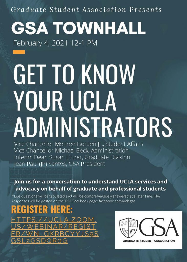 The Graduate Student Association (GSA) invites you to its GSA Winter Quarter 2021 town hall with VC of Student Affairs Monroe Gorden, Administrative VC Michael Beck, and Graduate Division Dean Susan Ettner on Thursday February 4th, 2021 12-1 PM, hosted by Graduate Student Association (GSA) President, JP Santos. The focus of this discussion is how to navigate UCLA campus and its resources, and work being done to support our graduate and professional student body better, even in a post-pandemic world. See the attached flyer for registration details!