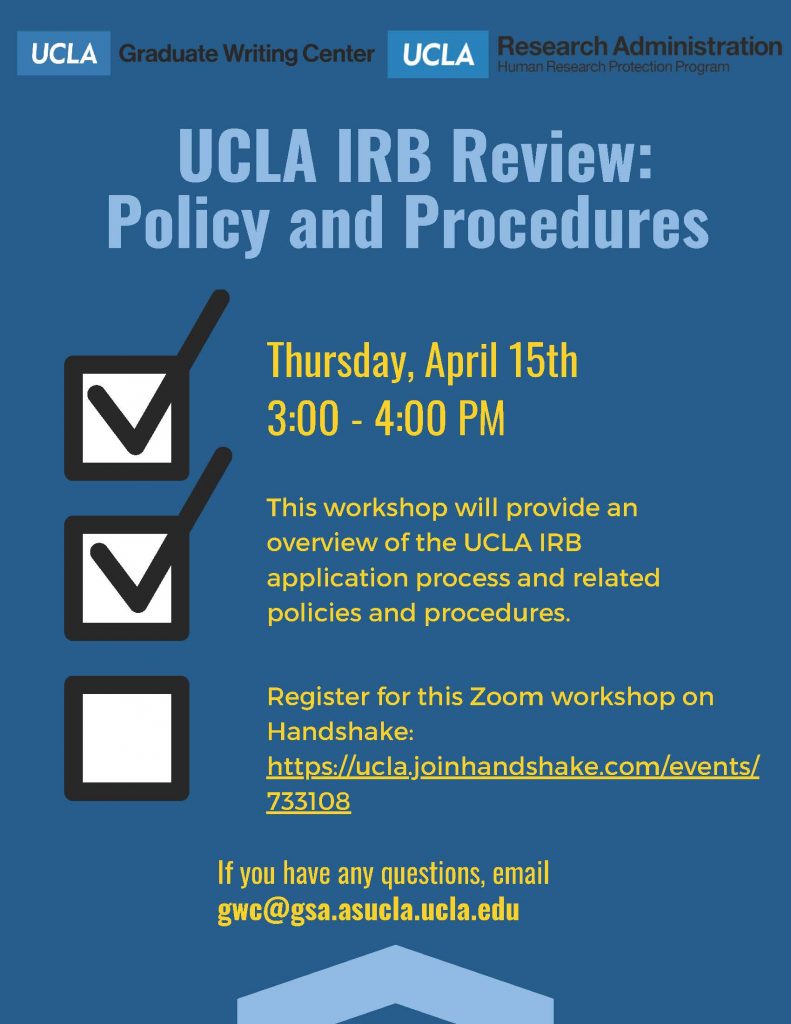 This workshop will provide an overview of the UCLA IRB application process and related policies and procedures. It will be conducted remotely on Thursday, April 15th, from 3:00-4:00 PM via Zoom. RSVP on Handshake to receive an invitation: https://ucla.joinhandshake.com/events/733108
